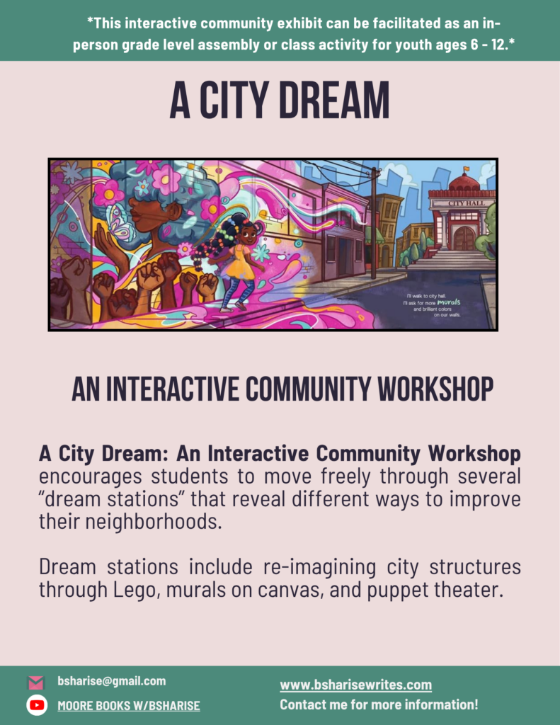 A City Dream: An Interactive Community Workshop is inspired by A City Dream, the 2025 picture book by B. Sharise Moore and illustrated by Trudi-Ann Hemans. After a read a loud of the book, the workshop asks students to visit five “dream stations” that introduce…
