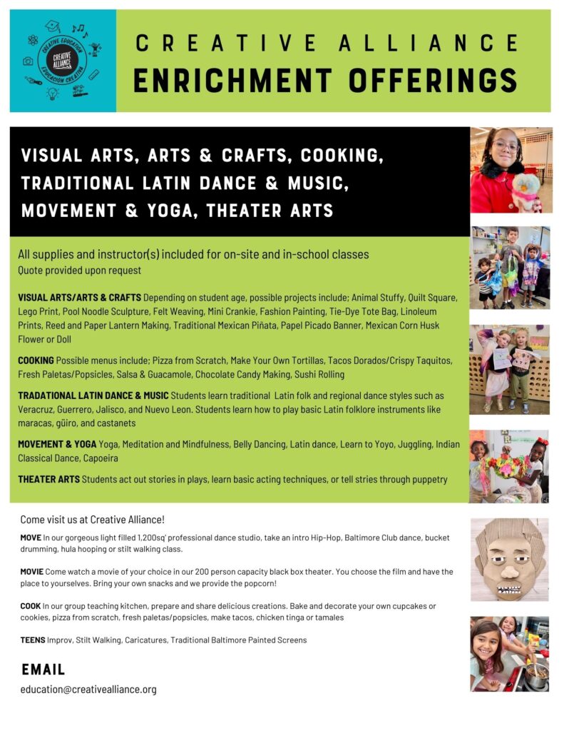 Join Creative Alliance in-school or after-school for some spectacular arts offerings. From all day supplemental arts enrichment, mindfulness and meditation to start your day, or cooking classes for an after-school snack. We provide exceptional teaching artist for a unique class. Please see our flyer for…