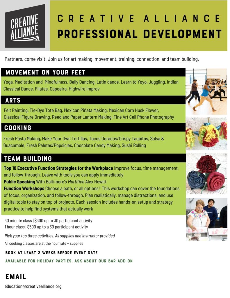 MOVEMENT ON YOUR FEET, ARTS, COOKING, TEAM BUILDING Come visit the Creative Alliance Creativity Center! For a professional development day your team will have our entire building. This includes two classroom, a community kitchen, and dance studio. Please see our flyer for highlighted program offerings.…