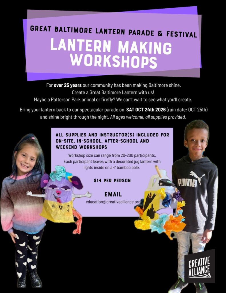 For over 25 years our community has been making Baltimore shine at The Great Baltimore Lantern Parade & Dia de Los Muertos Festival. Create a great lantern with us! All supplies and instructor(s) included for on-site, in-school, after-school and weekend workshops. All ages. Workshop size…